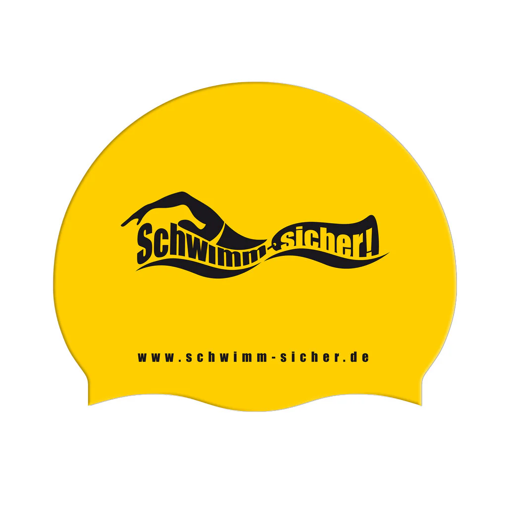 Hochwertige Badekappe aus langlebigem Silikon mit www.schwimm-sicher.de Logo-Print.